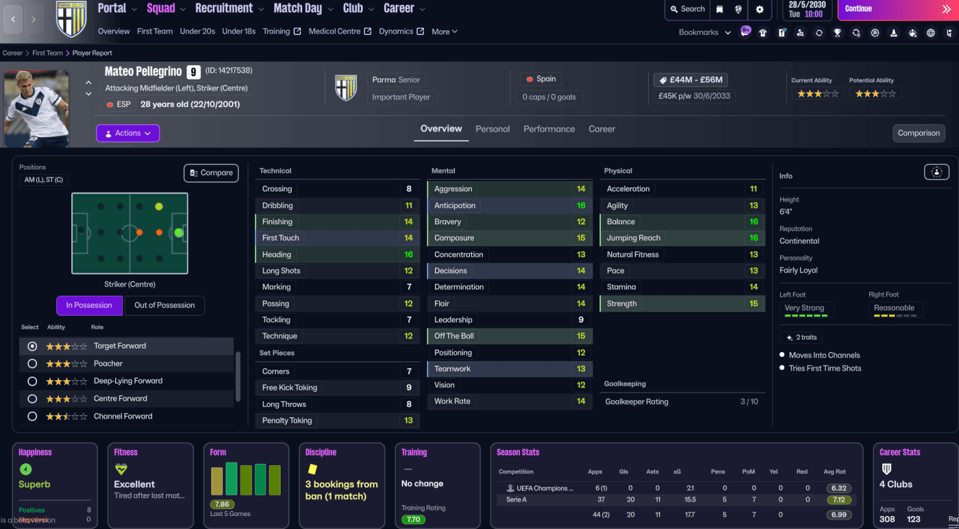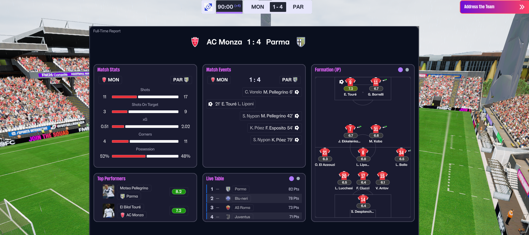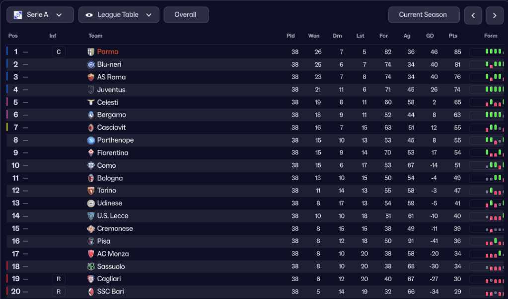 However, with the FM26 Beta period now completed, Alessio Rinaldi decided that he had achieved all he could at Parma. Rinaldi departs his hometown club after 249 games in charge, of which he won 145, drew 51 and lost 53, scoring 468 goals and conceding 263. He leaves the club with £130m in the bank and debt free, despite having a new stadium on the way in the next two years, but with players increasingly demanding annoyingly high wages.