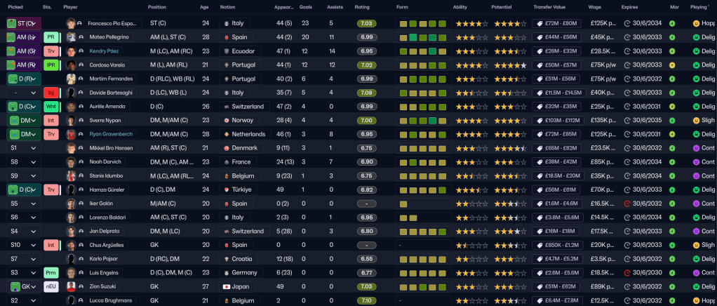 Parma’s plans were rocked as star man Kerim Alajbegovic demanded a transfer to “play with better players.” Rinaldi told him he could leave for his minimum fee of £64m, and Bayern came in with a new club record £66m offer. Rinaldi moved on backup midfielders Martin Baturina for £3.5m to Montpellier and Guido Della Rovere to Hannover for £1.3m, which boosted the transfer budget to around £100m. Rinaldi bolstered his attacking options with winger Stanis Idumbo for £15m from Monaco, Kendry Páez on loan from Chelsea and promising striker Lorenzo Baldari for £1m from Palermo. He also decided the squad needed a bit of experience, so he paid £475k to bring in Ryan Gravenberch for a year on loan from Liverpool.