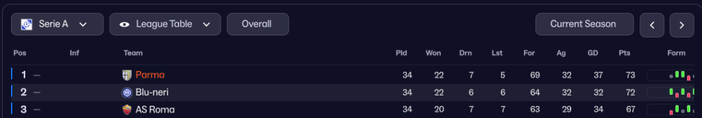 Parma began the 2030s with a tricky run of fixtures. Their title hopes took another hit as they lost 2-1 at Atalanta. But Esposito’s smart finish just before halftime nicked a 1-0 win at Milan and Páez’s early goal earned a 1-1 at Napoli. Roma finally lost at Atalanta, taking Parma back level on points with them before Esposito’s back-to-back doubles earned a 2-1 at home to Juventus and a 2-2 at Inter, who’d crept up to join Parma and Roma in the title race.