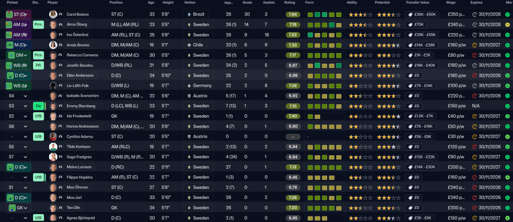 That saw Alingsås win the league at a canter, finishing on 69 points after 22 wins, 3 draws and just 1 defeat, 20 points clear of AIK. They were the top scorers with 72 goals and had the best defence with 23 conceded. Baiana was easily the best player in the league with 30 goals, 12 more than anyone else, and a 7.84 average rating. While Österlind led the league with 18 assists and Tea Olin topped the clean sheets with 10. And Holm deservedly won Manager of the Year.