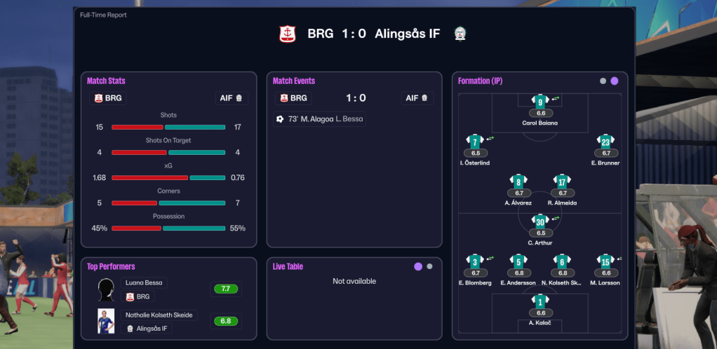 Alingsås opened up with a trip to Brommapojkarna and struggled a little in a 2-1 defeat. They improved slightly at home to Växjö, with Brunner laying on late goals for loanees Emilia Migas and Ilona Walta, and built on that with a comfortable 2-0 win at Linköping with goals by wingers Lexi Lloyd-Smith and Ina Österlind, before getting dominated 3-1 at home to champions Häcken. Brunner impressed again with two more assists in a 2-0 win at Djurgårdens.