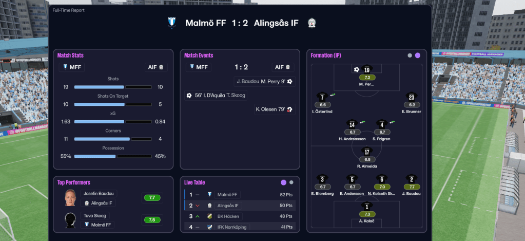 With three games remaining, Alingsås were six points behind leaders Malmö and two behind Häcken. They moved a point closer to both with a 1-1 against Trelleborgs before a huge trip to Malmö. Alingsås started superbly as right back Josefin Baudou crossed for Perry to tap in. Malmö edged the game and drew level with a great run that was criminally unpressured. But, completely against the run of play, Brunner cut inside and her shot was deflected past a stranded keeper.