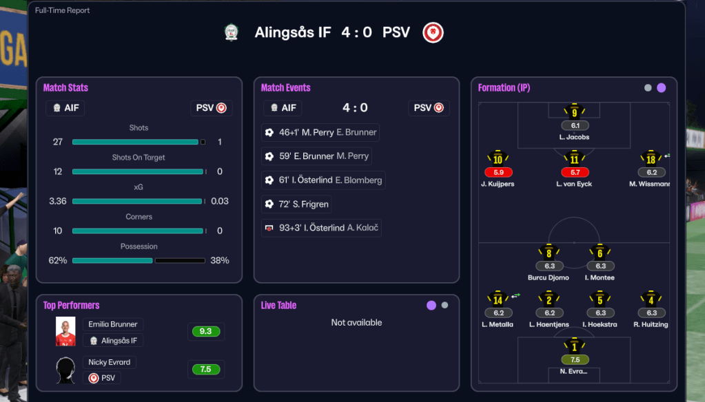 However, Alingsås instead dropped into the Euro Cup, which, pleasingly is a straight knockout competition of two-legged ties. They took on PSV in the second qualifying round, with the home leg first and dominating the early stages with 10 shots inside 20 minutes. Perry eventually put them in front in first half injury time and repaid the compliment for Brunner after an hour. Österlind made it comfortable before midfielder Sara Frigren curled home a beauty to seal probably the most dominant win of Holm’s career. Brunner starred again with a goal and assist for Perry in a 3-1 away success to cruise into the last 16.