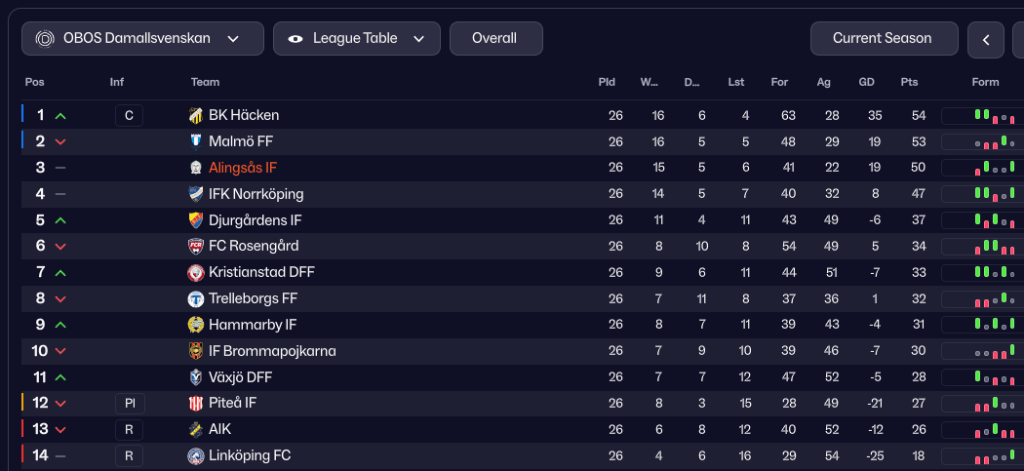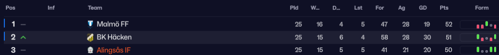 That win saw the top three separated by 2 points going into the final day. Alingsås faced a trip to Norrköping, Malmö hosted Brommapojkarna and Häcken hosted relegation-battling AIK.