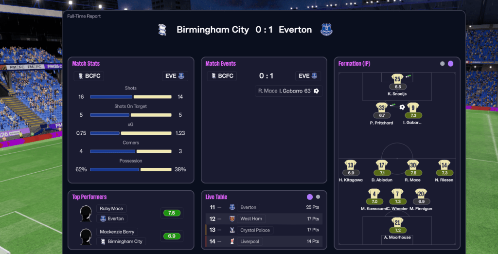 Everton FC is a professional football club based in the city of Liverpool, in northwest England. The club was founded as Hoylake WFC before becoming part of the Everton FC family. As of 2025, at the start of this save, the club took full ownership of the 39,572-capacity Goodison Park, which had hosted Everton men’s games before they built a new stadium. Everton has one English title, won back in 1998, as well as two FA Cup, one League Cup and one second-tier WSL2 success.