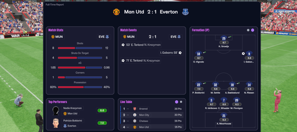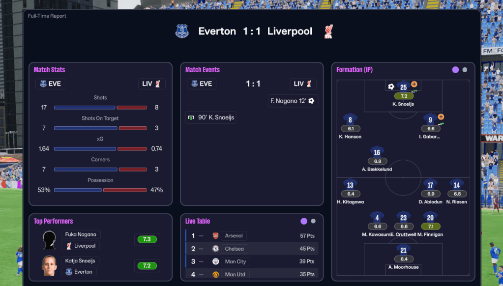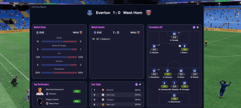 Holm’s first taste of English football was a spicy one as Everton welcomed city rivals Liverpool to Goodison Park for a League Cup tie. And she quickly realised the massive step up she was making as she walked out into the huge stadium to be introduced to her new supporters – it was one hell of a change from the 150 seats at Alingsås in rural Sweden! Her first game didn’t start well as Moorhouse fumbled a shot to Liverpool’s striker and Everton offered nothing. Holm switched to a 3-4-3 at halftime and it appeared to work as Gaborro dragged them level from the second phase of a corner, and they more than deserved the 1-1 that took it to a penalty shootout, which they lost (thanks to the game freezing at penalty takers selection).