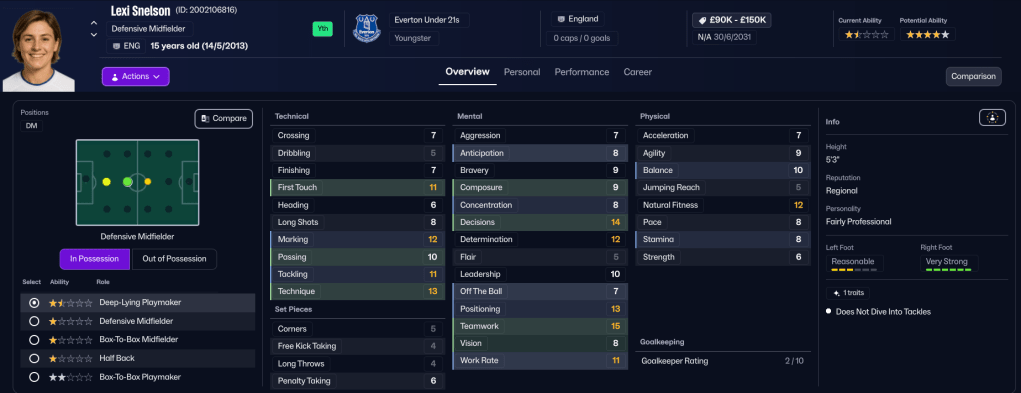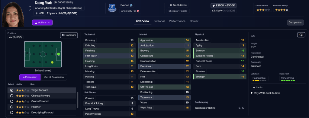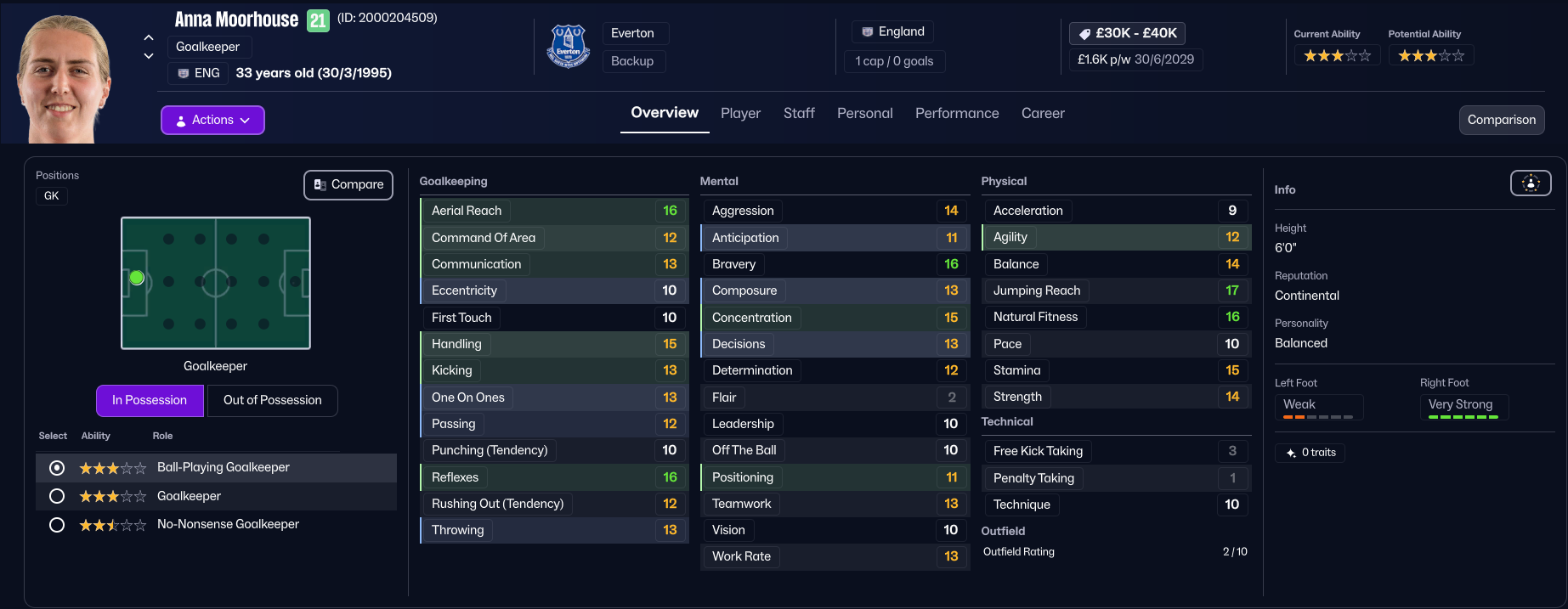 Everton currently play in the Barclays Women’s Super League, but is currently 14th and bottom with just 4 points from 12 games. That’s thanks to a steady decline, having finished 7th in the first season, then 9th and 10th, which ended manager Brian Sorensen’s six-year reign. Despite that, the club represents a massive step up for Holm, with £1.2m in the bank, a transfer budget of £325k and £2.5k spare in the £50k weekly wage budget. The club also has excellent training facilities and superb youth facilities, but lacks a little in youth recruitment and junior coaching.