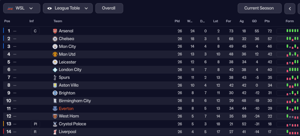 Everton were much improved at 6th-place Spurs as Riesen and a late goal by backup striker Poppy Pritchard nicked all three points to lift them to the heady heights of 11th. That took Everton into the final five games with a 5-point gap over Liverpool, who had a game in hand, and 2 points clear of West Ham and Crystal Palace.