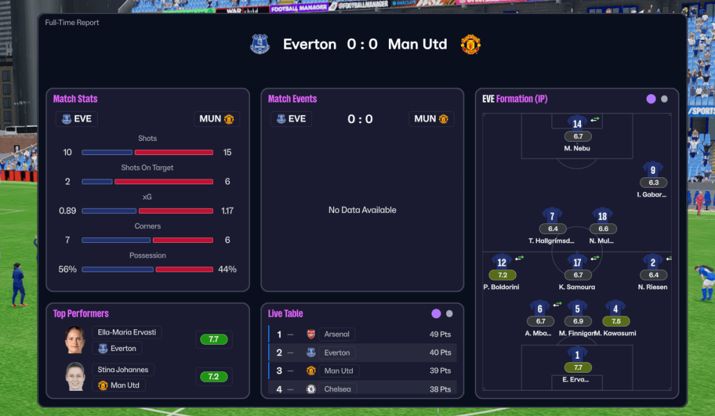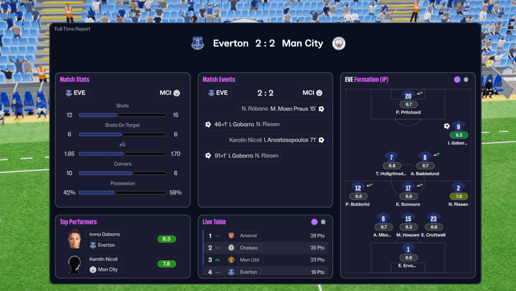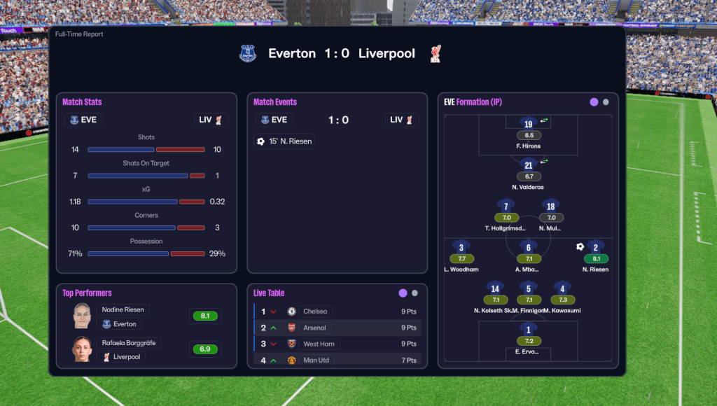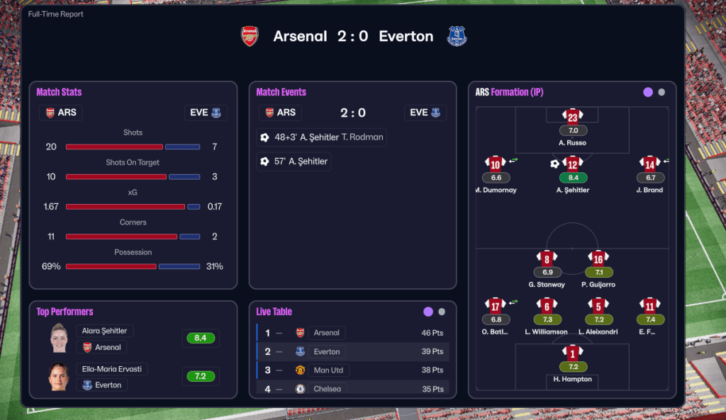 At least 4th place was secured as Gabarro’s penalty and centre backs Momoko Kawasumi and Megan Finnigan downed Birmingham 2-1. A big game at City followed and two goals in four minutes, thanks to FM26’s love of non-existent marking in the six-yard box, saw the hosts win 2-1. But Everton were really unlucky as Gabarro missed a huge late chance before Riesen hit the bar with the last kick of the game.