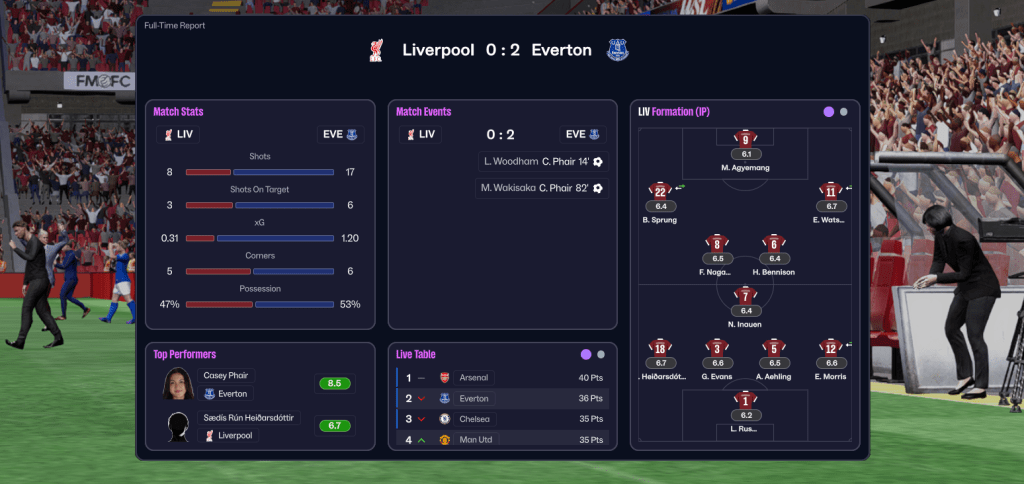 Gabarro’s brace inspired a big win over Villa to move Everton 12 points clear of West Ham in 5th and young striker Misaki Nebu earned a 1-1 at Leicester, which lifted them into 3rd as Chelsea lost at Villa. A Merseyside derby followed at Anfield and Phair put Everton in front with a towering backpost header, before Mulot and wingback Eva Gray both hit the bar with long-range efforts. But Phair wrapped up the win with a sumptuous curling 25-yarder.