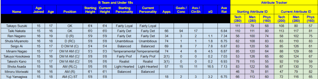 As you can see in the chart below (click to enlarge), the likes of Nishi and Kodama have improved massively this season. Nishi has improved by 12 technically, 14 mentally and 9 physically, while Kodama has improved by 9 technically, 17 mentally and 13 physically.