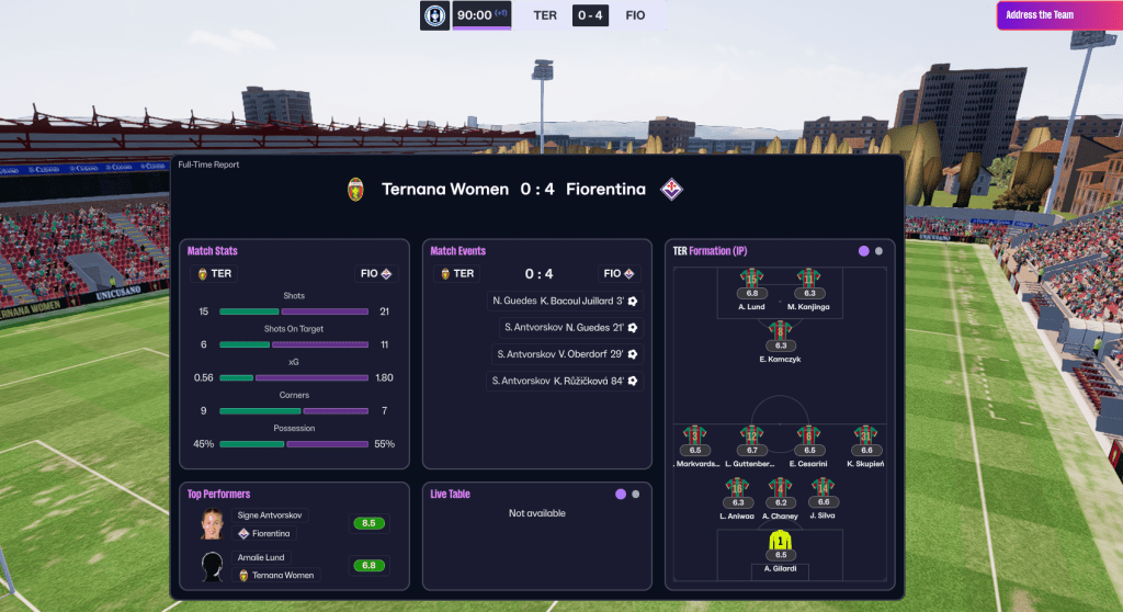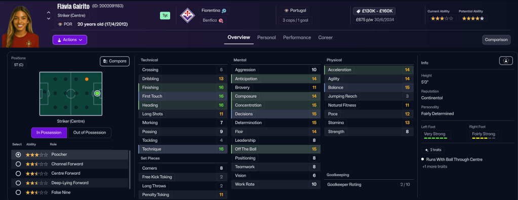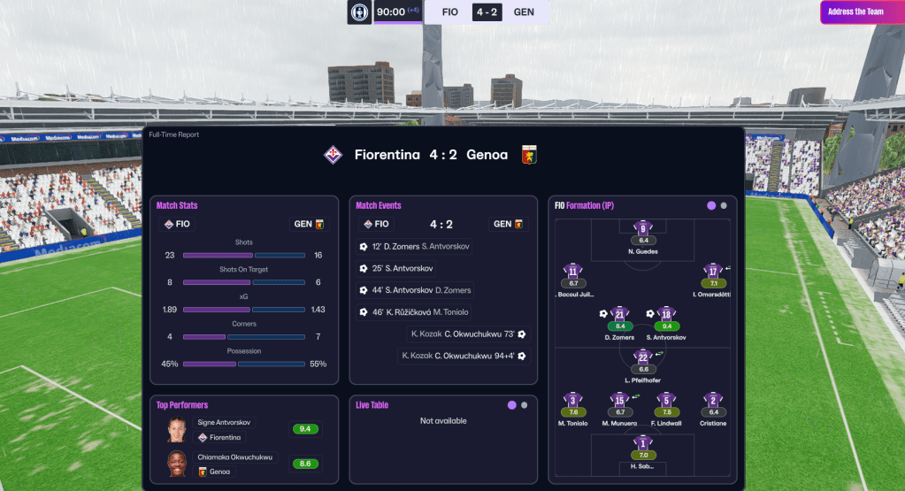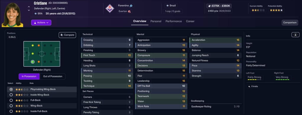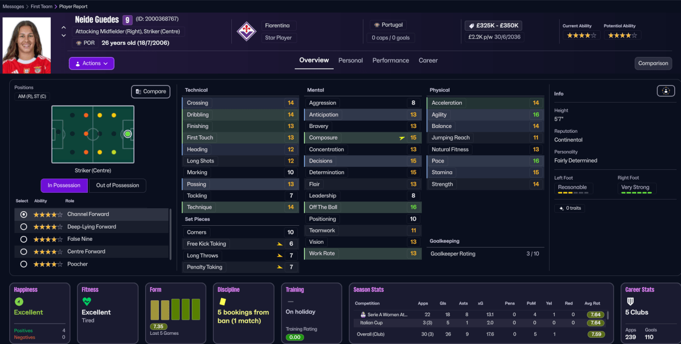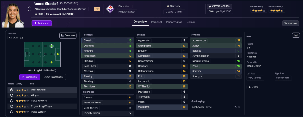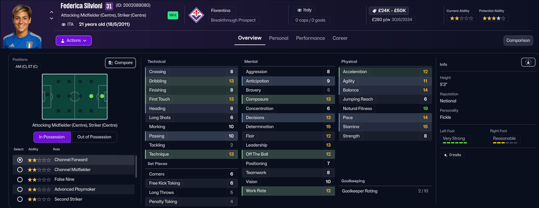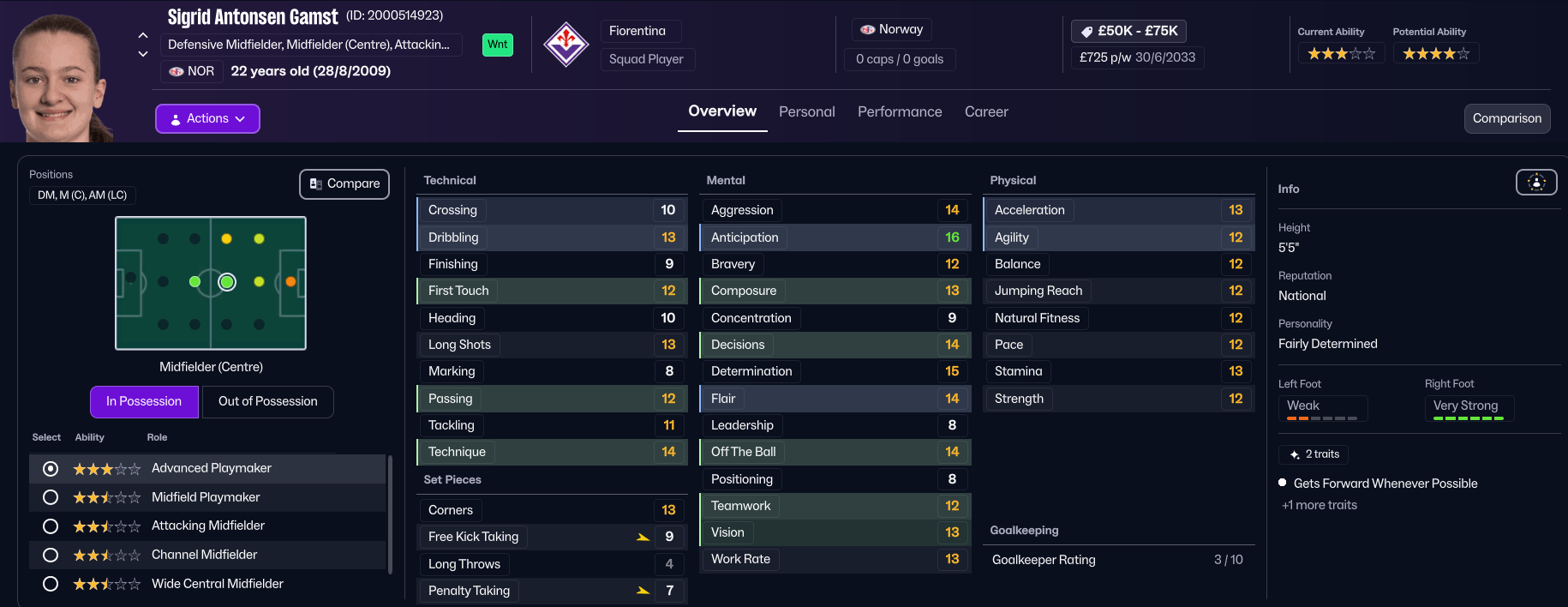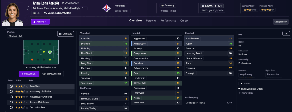 Fiorentina play at the 3,000-capacity Stadio Curva Fiesole, which is located within the Fiorentina training complex, Viola Park, built in 2023. Surprisingly, it has poor training facilities, below average youth facilities, which Holm requested be improved during her interview, average youth coaching and above average youth recruitment. There’s £1.7m in the bank, with £1.3m in the transfer budget and £10k of a £30k weekly wage budget going spare. Ironically, the club has a worse reputation than Everton (national v continental), but Serie A looks far less competitive. And there’s some pressure on Holm, as the board expects the club to finish in the top three.