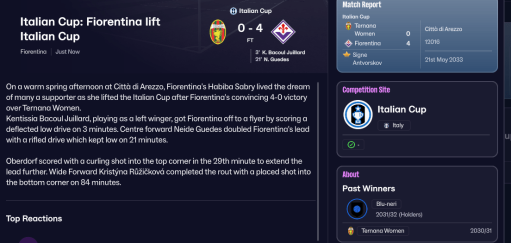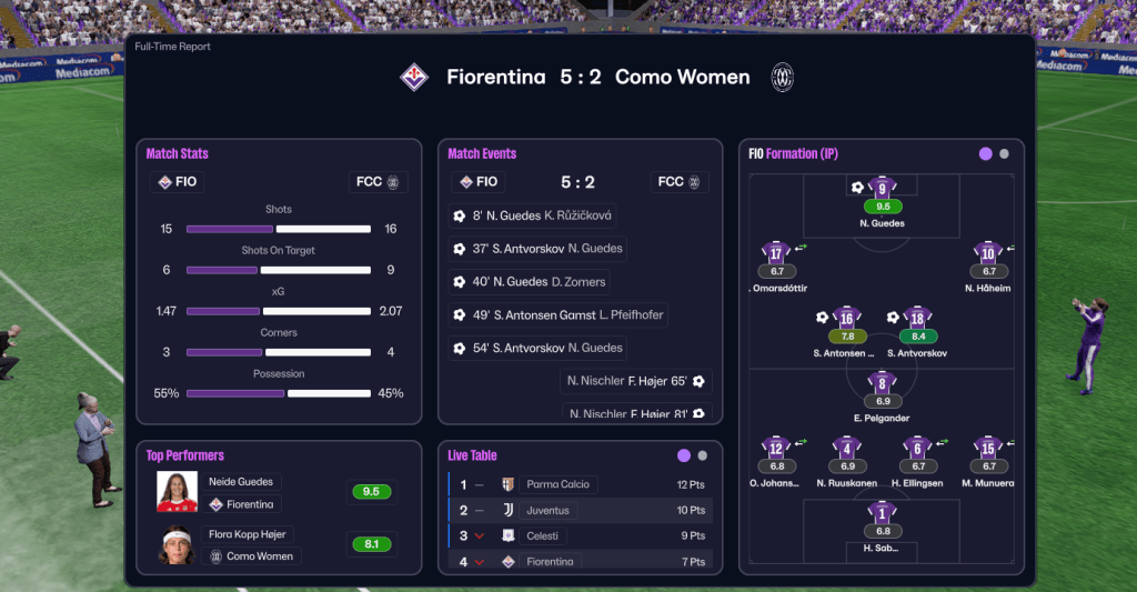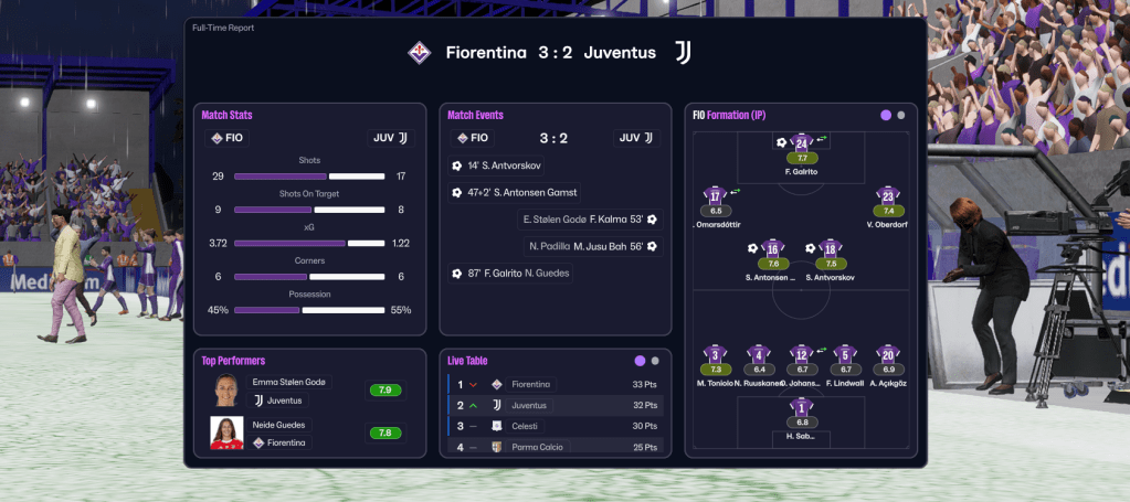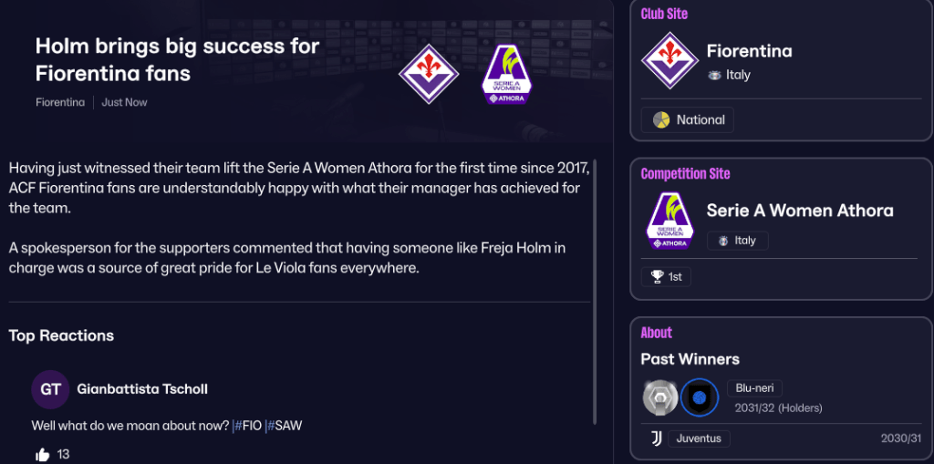 That saw Fiorentina win the title by 6 points, finishing on 51 points after 15 wins, 6 draws and 1 defeat, scoring 60 and conceding 26. Guedes was the top scorer with 18, with Gamst joint-8th top scorer on 9 goals, and Guedes (7.64), Oberdorf (7.52) and Ruzicková (7.37) were in the top six for average rating. And Guedes, Pelgander, Toniolo, Lindwall and Ruuskanen were named in the team of the season, and Holm of course won Managers’ Manager of the Year.