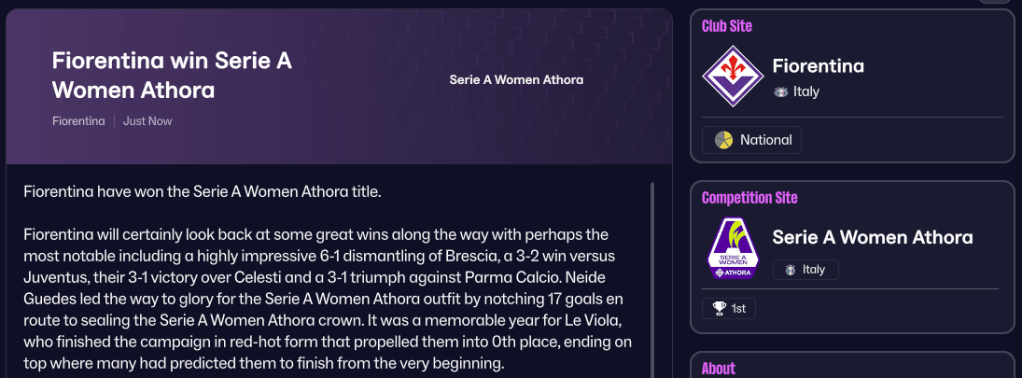 Matchday 20: Como (12th, away): Fiorentina could secure the title with a point at relegation-doomed Como if Juve lost. They bossed the early stages at Como, and eventually went in front as a brilliant run and cross by Toniolo was powered home by Oberdorf. Juillard doubled the lead 2 minutes later, before Oberdorf went close after a sensational solo run. Pelgander’s penalty wrapped up all 3 points, centre back Freja Lindwall headed in from a corner and Galrito tapped in a fifth.