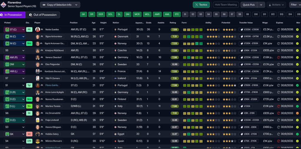 The best player at Fiorentina is French winger Kentissia Bacoul Juillard, the club’s record signing for £200k from Como in 2029, along with Danish midfielder Signe Antvorskov, Finnish centre back Nanne Ruuskanen, Czech winger Krystyna Ruzickova, left back Martina Toniolo, Swedish midfielder Elsa Pelgander, Icelandic winger Dilja Yr Zomers and Norwegian midfielder Sigrid Antonsen Gamst. Holm was slightly concerned about the age of the first team, and there was a real lack of potential in the youth squad, with 21-year-old striker Federica Silvioni being the best prospect.