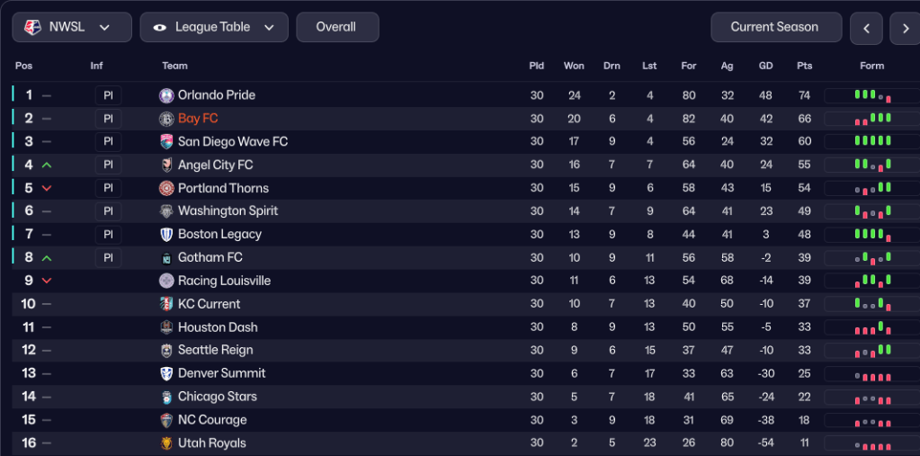 The good form continued, including Crutwell and Banda leading a 3-1 win over KC Current and an Oberdorf earning an impressive 3-2 win at Angel City, to firmly cement Bay FC in 2nd place, albeit a long way behind the relentless Orlando. But Bay FC finished the season in scintillating form, including the irrepresible Jónsdóttir’s assist hat trick inspiring a 6-1 away thumping of Utah Royals. However, they finished the season with defeats in tricky games against Orlando and San Diego.