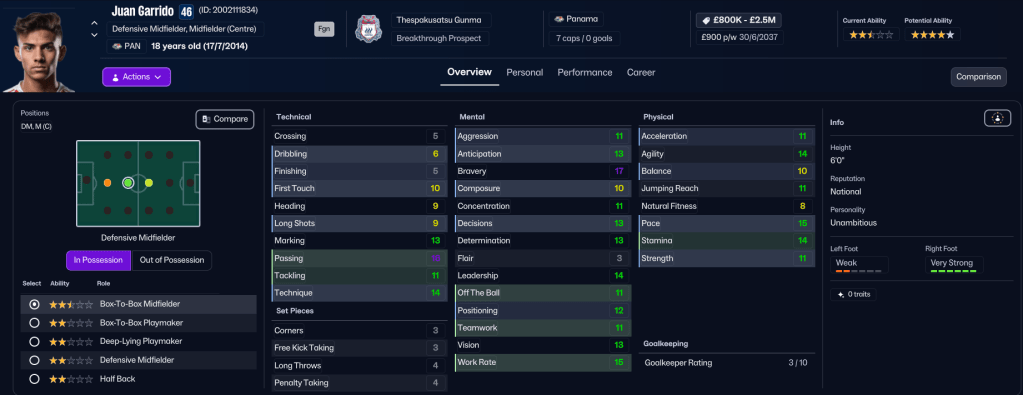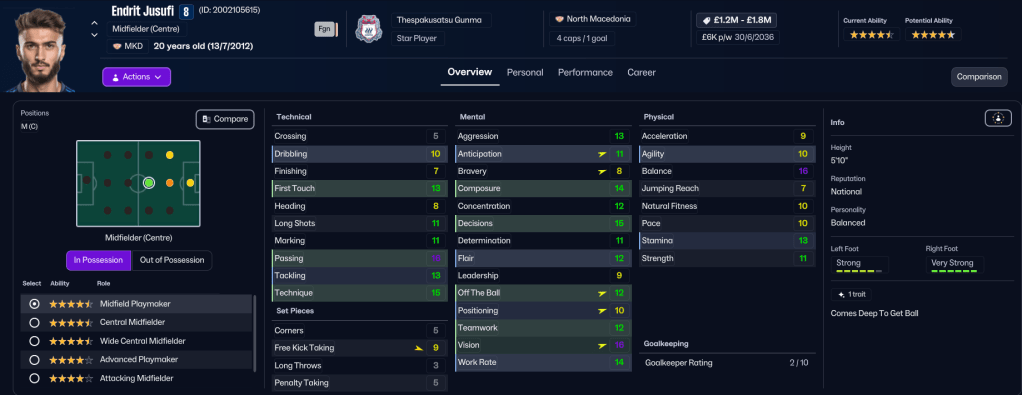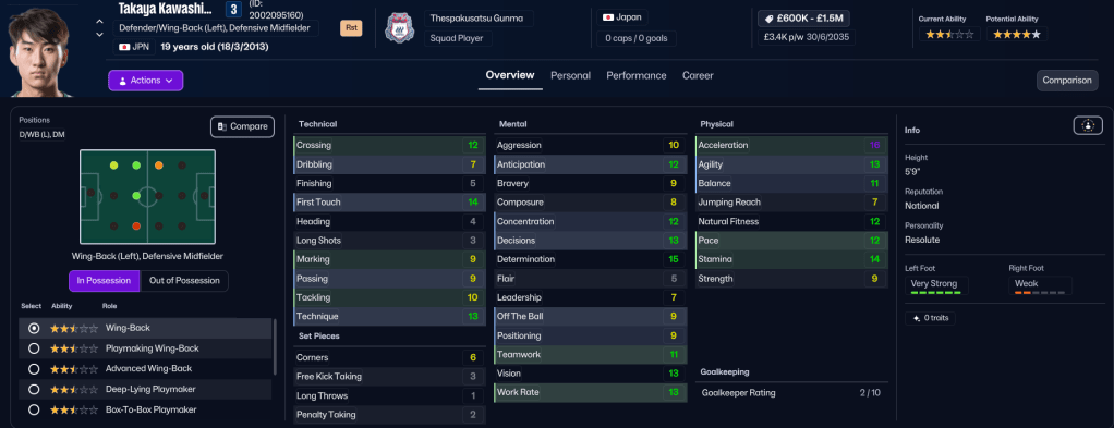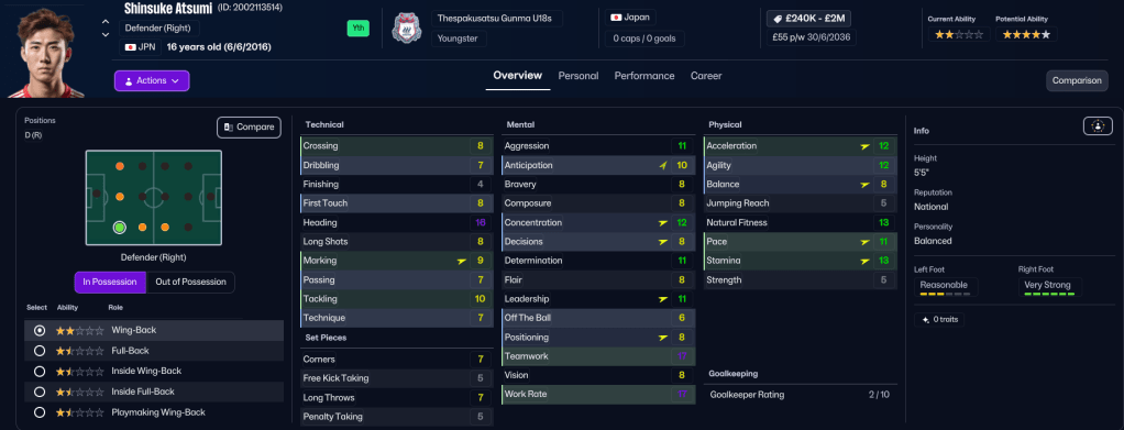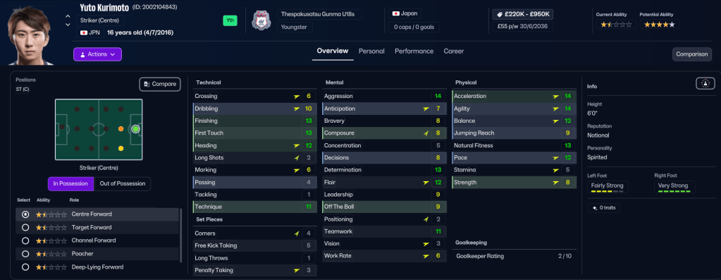 Gunma came into the new season with £10m in the bank for the first time. That was boosted as Rasamu began restructuring the team, selling underperforming midfielder Luc Andre Siakam to Damac for £1.2m, centre back Naoki Higashi to Saudi for £850k and, potentially controversially, captain Ryotaro Kodama, who hadn’t played well for two years, was too small to be a defender and couldn’t pass, to Saudi for a new club record £2m. He also allowed 10 players to leave at the end of their contracts, giving him a transfer budget of £8.3m with £42k spare in a £95k weekly wage budget.