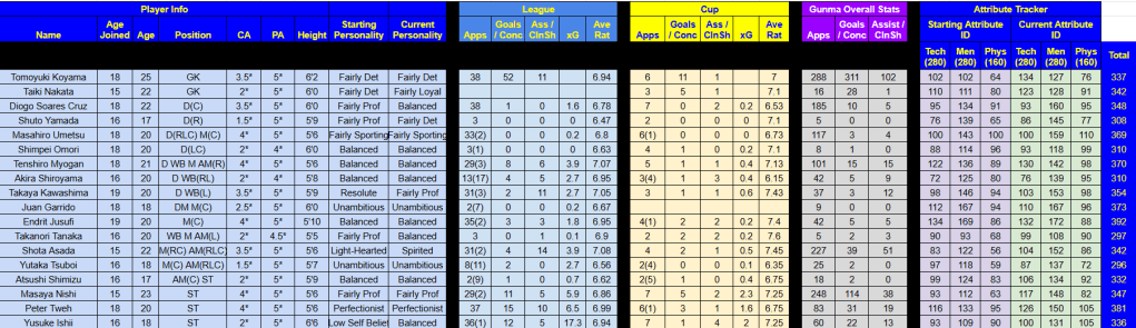This season marked the first time the Gunma squad is fully homegrown at the club. And those homegrown talents combined for 393 league games, 63 goals and 60 assists, along with 83 games, 35 goals and 20 assists in the cup. Rasamu’s attribute ID system identifies Jusufi as the best player at the club (392), followed by Twesh (381) and, surprisingly, Umetsu (369). Check out all the stats and details from the squad by clicking the chart below.