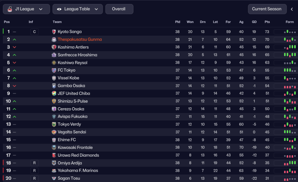 Rasamu reached 300 games at Gunma with Tweh nicking the only goal at Gamba Osaka in late October. Gunma’s form dropped off a little, but so did the teams around them, and they headed into 2033 sitting top of J1, leading Kyoto Sanga by 2 points and Gamba by 6 points. However, holders Kashima were 9 points behind with three games in hand.