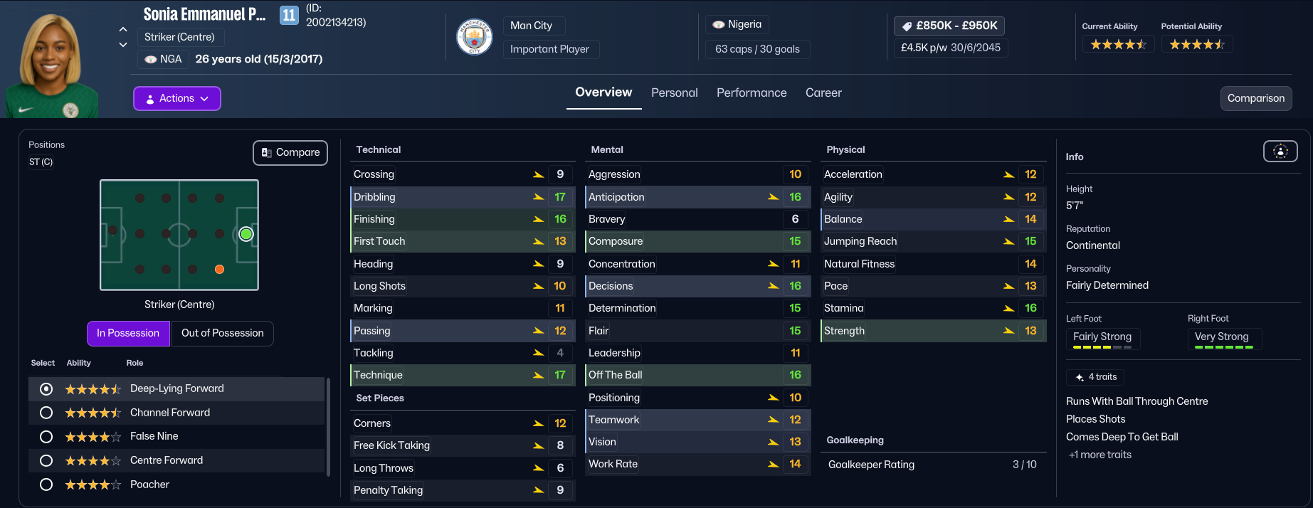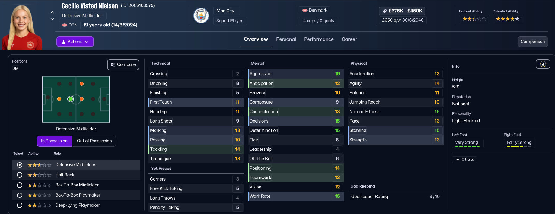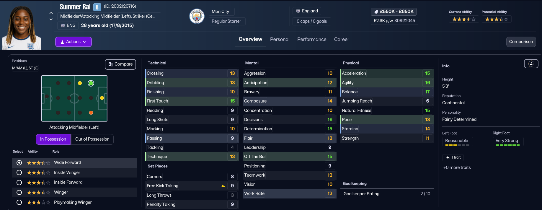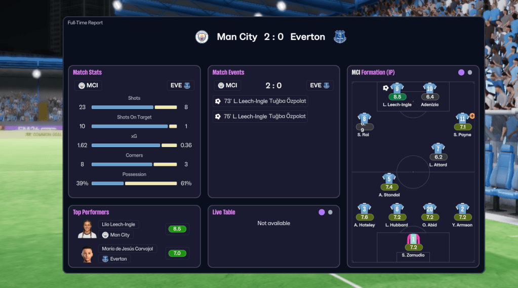 Unsurprisingly, the finances weren’t great, with City having a bank balance of minus £866k, a transfer budget of £0 and £8k over their £49k weekly wage budget. City play at the Joie Stadium in Manchester and train at the City Football Academy, which has superb training and youth facilities alongside excellent academy coaching and exceptional youth recruitment. Holm’s first task was to address the financial mess, selling 19 players for £1.9m and releasing 12 more to free up £20k in wages.