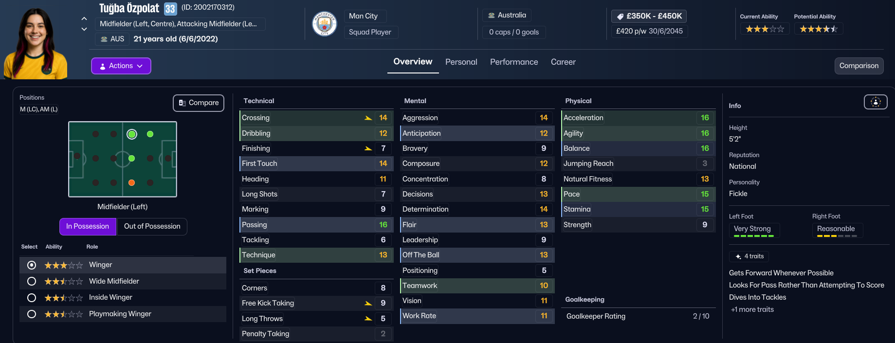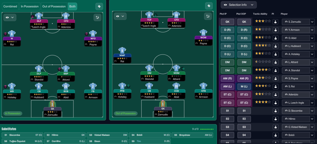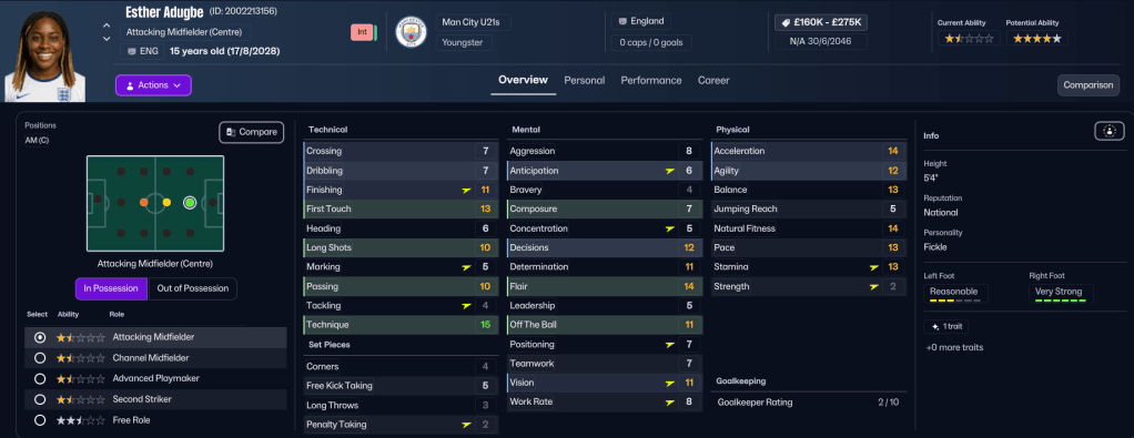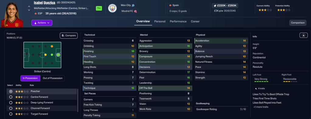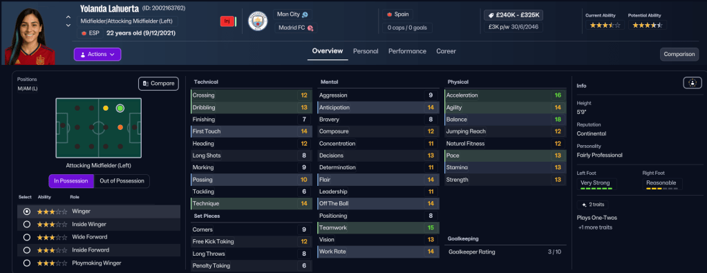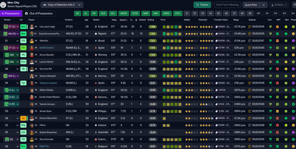 Some interesting news items appeared in Holm’s inbox early in the season. Firstly, the contract of her favourite player Verena Oberdorf, who is still amazing at 33, was expiring, so she swooped in to sign the winger for a third time from Bay FC. Then, just as the summer transfer window closed, Madrid CFF loan listed winger Yolanda Lahuerta and striker Isabel Uueziua. So, obviously, Holm put in bids for both and got both. Lahuerta comes in with an option to buy for £450k and Uuezuia joins permanently for £150k in the summer. While annoyingly, Madrid’s star player Ana Morera also departed for Arsenal for £1.5m. But Holm was at a loss to explain what her former club was thinking of! And those deals were supported by selling Ozpolat to Gotham for £450k and 5ft 5in centre back Hubbard moved to Barcelona before her contract expired.
