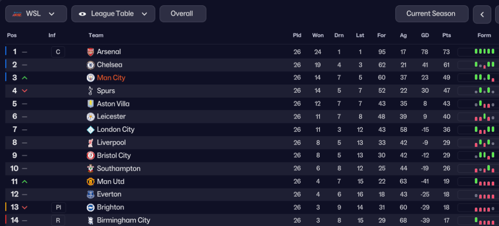 Despite the positives of that Chelsea result, the dropped points left City 6 points behind them and 7 points back from Arsenal after nine games. City got back on track with another Leech-Ingle double inspiring a 6-2 hammering of Birmingham, before a 2-1 loss at Spurs sent them into the winter break in 5th place in WSL.