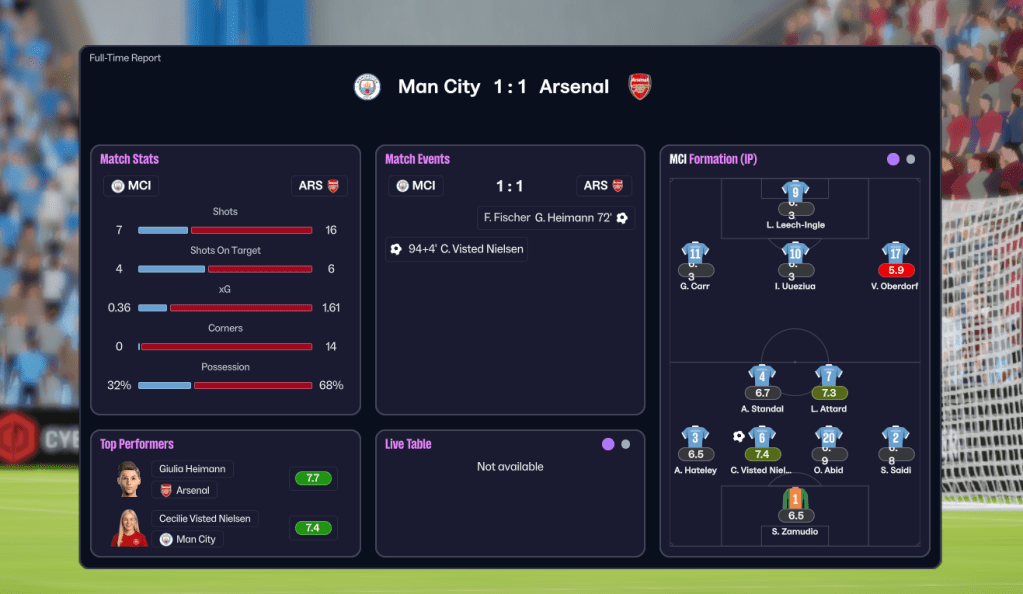 City began the season against Holm’s former superstar Ana Morera and champions Arsenal. And it proved a good time to play them as, just like last season’s cup final, they managed to just about mullify Arsenal until an absolute screamer on 72 minutes. But, just as they seemed to be drifting to a defeat, centre back Visted Nielsen picked the ball up 30 yards and drilled it into the bottom corner to nick a draw. They built on that by annihilating Holm’s former club Everton 6-2 led by a Leech-Ingle hat trick and Uueiziua followed suit to inspire a 3-0 victory at home to Aston Villa.