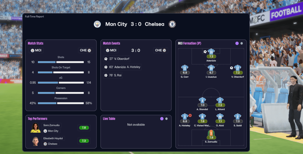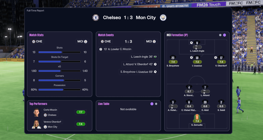 Gameweek 25 – Leicester (7th, away): City again struggled to get going, before Carr and Leech-Ingle both missed two huge chances. And they drifted to a pretty disappointing 0-0. And, despite the lack of a trophy lift (what a surprise, FM26 can’t work out you’ve won the league), that was enough for the title.