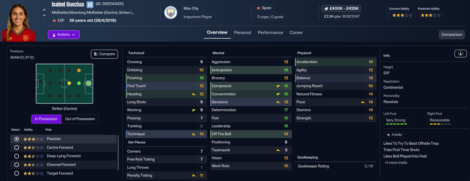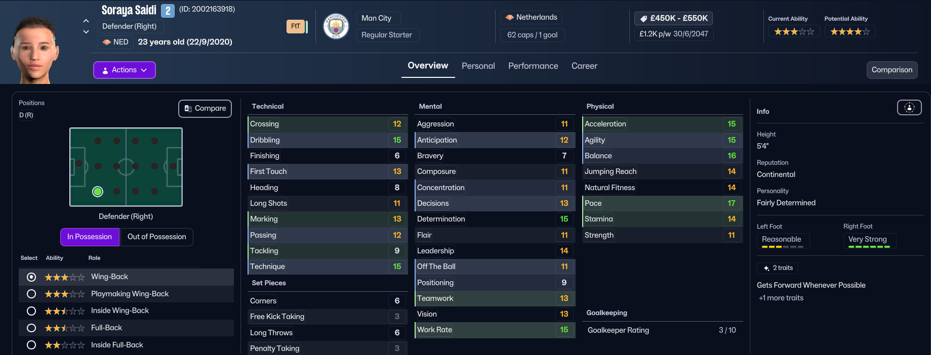 Holm decided not to cash in on loanee Yolanda Lahuerta, but did bring in two of her former Madrid CFF players in Isabel Uueziua for £150k and midfielder Camila Paviatto for £200k. The weakest area Holm wanted to address was right back, so she brought in the attack-minded Soraya Saidi for £200k from Bristol City, along with attacker Georgia Carr on a free from Fleury (and, for some unbeknownst reason, the newgen faces have stopped tracking through on the latest players, so apologies for the appalling standard faces).
