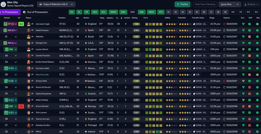However, as seemingly always in this save, the biggest barrier to that was financial. Despite their annual income being £1.5m higher than their expenditure, City were somehow £1.4m in the red at the start of the season. That said, Holm did have a £1.6m transfer budget to work with. That was boosted by a massive sale as Barcelona offered £3m for star winger Sonia Emmanuel Payne. Holm released eight players and sold X more for £200k.