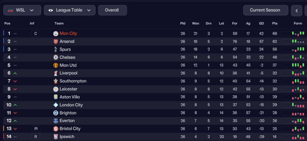 Gameweek 23 – Ipswich (14th, home): City had two weeks off and used that time well, as they dominated Ipswich by 12 shots to 3 in the first half without scoring. The bombardment continued and Attard eventually scored a 25-yarder, before Hateley and Leech-Ingle’s penalty secured a 3-0 victory. At the same time, Arsenal’s fixture congestion continued to hurt them as they drew 1-1 at Liverpool. That took City 7 points clear, and just 3 more points away from the elusive WSL title.