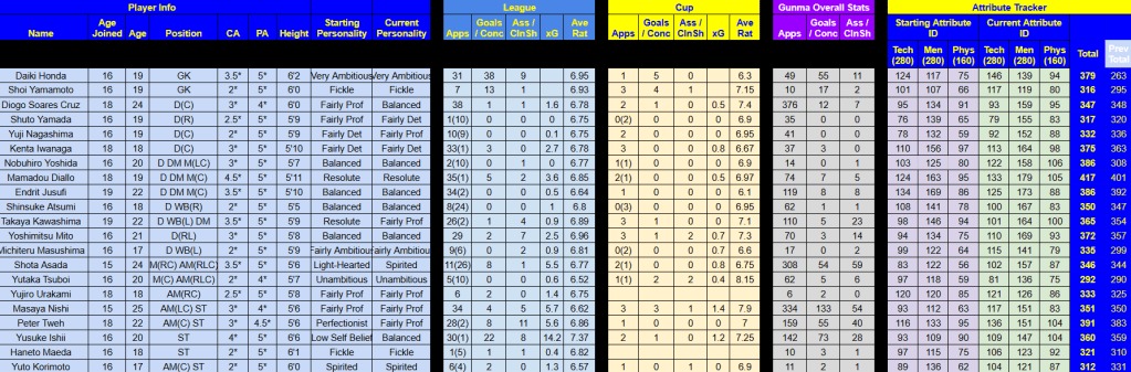 Rasamu was pleased that his decision to stick with youth had paid off as Gunma enjoyed a much better season. Ishii was again the main man with 23 goals and 8 assists in 33 games. Shota Asada and Tweh scored 8 apiece, followed by Nishi (7), Diallo (5) and Mito (4), while Tweh led the assists with 11, followed by the impressive wingback pairing of Tanaka (10) and Mito (9).