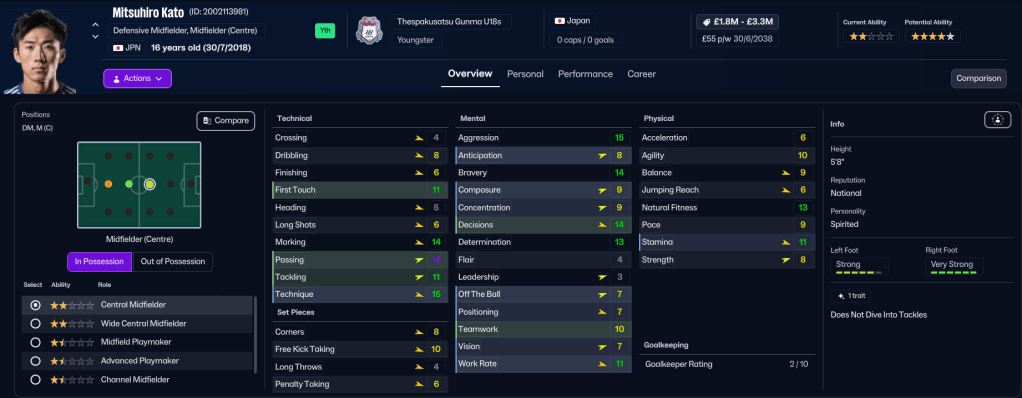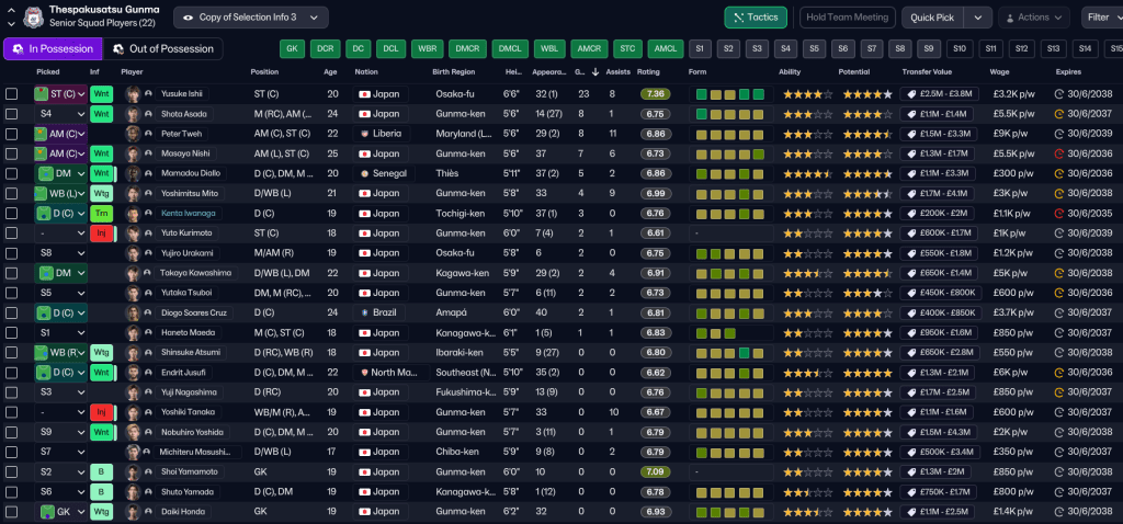As a result, Gunma had £23.3m in the bank, £18m in the transfer kitty and was only spending £59k of the £98k wage budget. But Rasamu resisted the urge to spend the money he’d accrued, largely as his recruiting focuses hadn’t delivered anything worthwhile. Instead, he promoted wingback Yoshiki Tanaka, who impressed in the youth team last season, striker Yuto Korimoto, midfielder Nobuhiro Yoshida, full back Michiteru Masushima and goalkeeper Shoi Yamamoto.