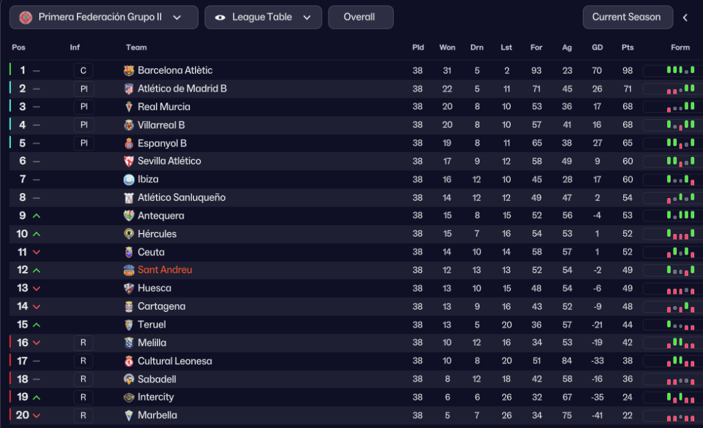 Sant Andreu came home in 12th place, finishing on 49 points after 12 wins, 13 draws and 13 defeats, scoring 52 and conceding 54, to avoid relegation by 7 points. Tejada was the league’s 4th-top scorer with 19 in 38 and also had the 4th-most shots (101) and 3rd-most shots on target (51). While Sergi’s 11 assists was only bettered by Ceuta’s Manu Vallejo, and Raúl was 22nd with 7 but had the 5th-best assists per 90 minutes (0.35). FC Barcelona’s B team dominated the league again, losing just twice to move into the second tier, just one league below the main club.