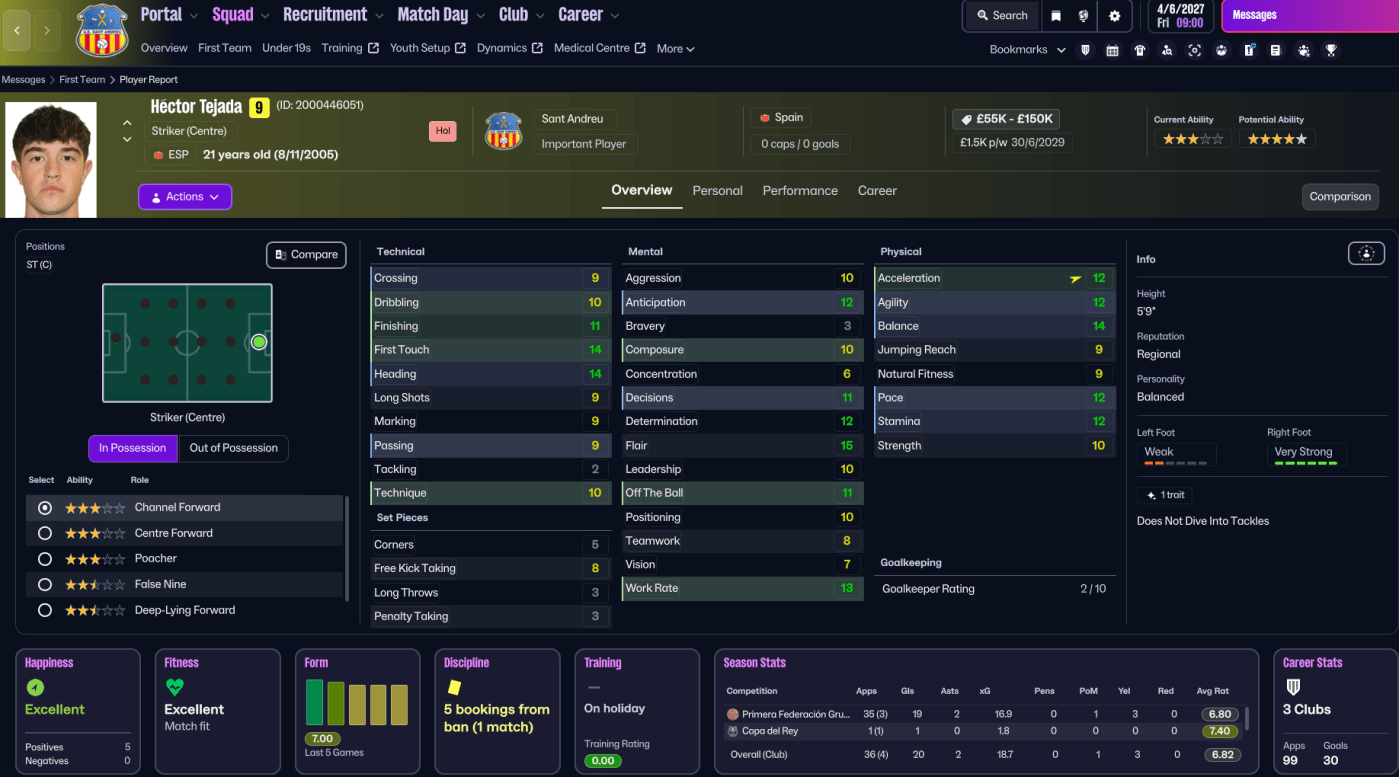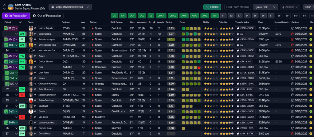 Ribas avoided the bookies’ expected relegation and just about achieved the board’s objective of finishing in mid-table. The impressive Tejada led the way with 20 goals in 40 games, followed by Sergi’s 11 goals and 12 assists – but only nine players scored a goal, and only 11 got an assist. However, Ribas’ main focus was on developing young stars, with Vazquez scoring 8 goals with 4 assists, Aurelí scoring 4 goals with 4 assists and Raúl scoring 2 goals with 7 assists. So he would need more from them next season, when Sergi wouldn’t be at the club, but there was no denying these players had masses of potential.