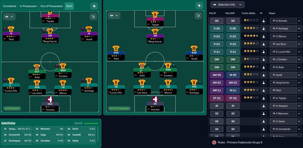 Ribas stuck with his 4-2-3-1 approach with Sergi still the lynchpin playing in the number 10 role. Academy stars Aureli and Raúl start out wide with Ávila coming in as the prime creative force in midfield and Saca slotting in at the back alongside new captain Blanco. But Ribas was pretty concerned about the inexperienced Kravets being his starting goalkeeper.