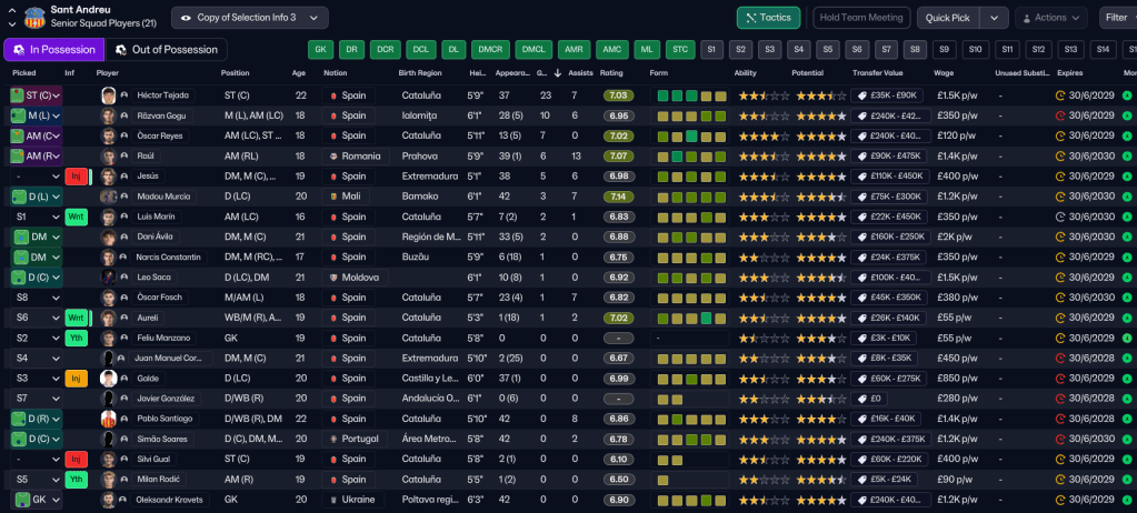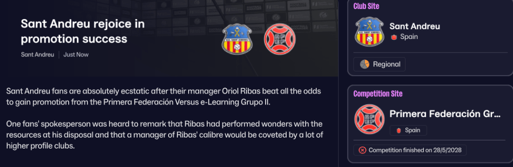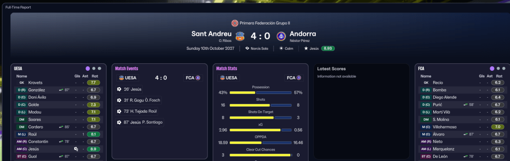 In their infinite wisdom, the Sant Andreu board decided to expand Narcís Sala by 1,607 seats, taking it to a new capacity of 8,170, at the cost of £2m they didn’t have. £1m was secured through a council grant, while the rest plunged the club into a further £1m of debt, taking it to £1.2m in total. As a result, the club came into the 2027/28 campaign £423k in the red, but the board did hand Ribas a £109k transfer budget while reducing his wage budget to £33k, of which he was spending £16k. Ribas also opted to form a Sant Andreu B side, which should, in theory, allow youngsters to play matches, given the U19s don’t play any.