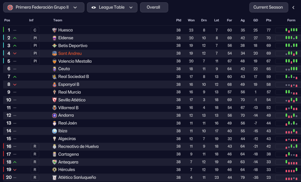To say this promotion wasn’t on the cards was a massive understatement, as Sant Andreu’s exciting youngsters snuck through the Primera Federación playoffs. Tejada again led the way with 23 goals in 37 games, followed by homegrown stars Gogu (10), Reyes (7) and Raúl (6), who led the assists with 13, followed by right back Pablo Santiago (8), Tejada, Murcia and Fosch (7) and Gogu and Jesús (6). Furthermore, this remarkable young squad had achieved promotion with a wage spend of just £17,870 per week.