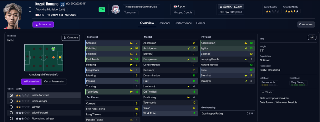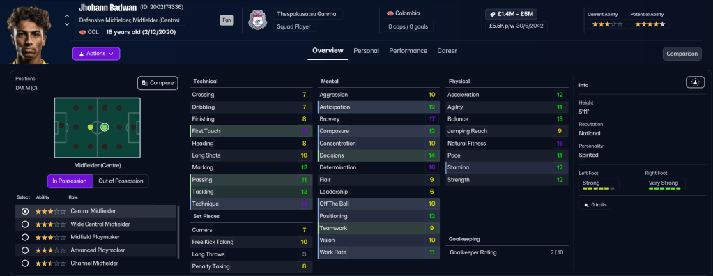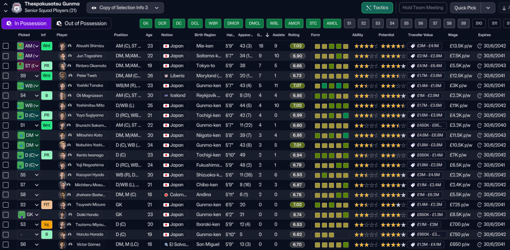 Gunma were also looking good off the pitch, as a £12.5m annual profit boosted the club’s bank balance to £41.9m. Rasamu had £35m in the transfer kitty and £170k spare in a weekly wage budget of £295k. That was boosted as captain Diogo Soares Cruz, who was 1 game short of the club’s all-time appearances record, decided he wanted a new challenge after 10 years at the club and moved to Saudi for £2.5m. They also sold midfielder Emiliano Ruiz Diaz and wingback Bui Quoc Dung to Saudi for £1.1m and £1m, a few homegrown players for an additional £2m, and Bulgarian striker Emil Ivanov went back home on loan.