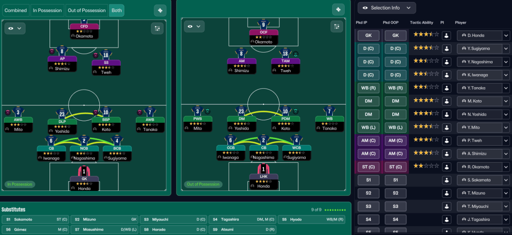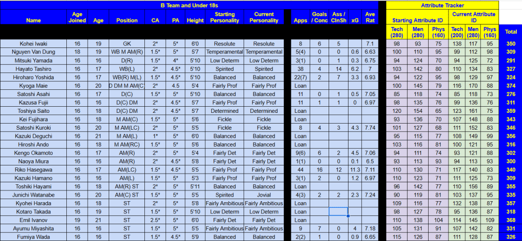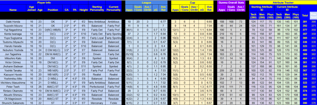 Midfield starlet Mitsuhiro Kato is the best player at the club with a score of 404 in Rasamu’s attribute ID system. He’s closely followed by Shimizu (403) and Yoshida (400). Click the chart below to see how the players have developed this season.
