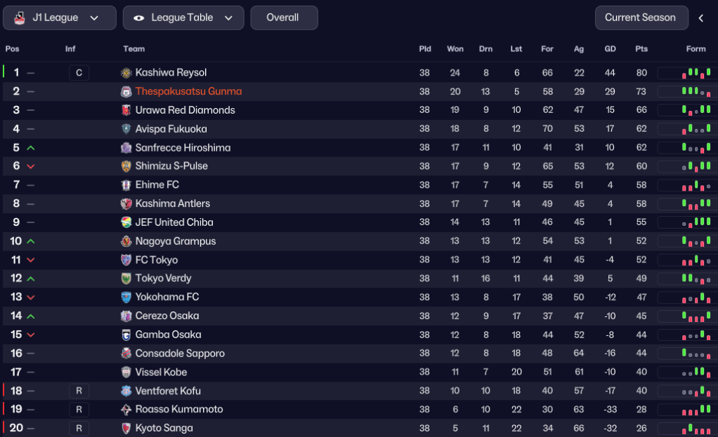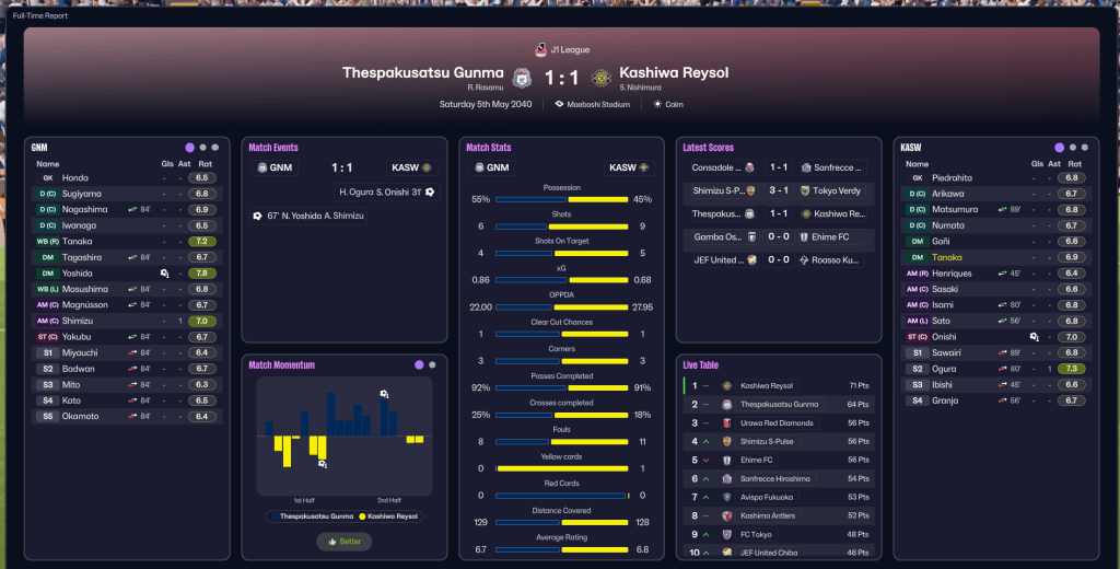 Off the pitch, that was certainly the case, as Gunma became the fourth most reputable club in Japan, behind Kashiwa Reysol, Gamba Osaka and Kashima Antlers. Chairperson Takanori Yamazaki announced plans to build a new stadium, and began the process of searching for suitable sites and possible investors. While another annual profit of £12.5m saw them go into the 2039/40 campaign with £49m in the bank. And Rasamu continued his mission to improve Gunma’s youth by securing the club’s first international affiliate agreements with Defensor Sporting in Uruguay and Al-Wahda in UAE.