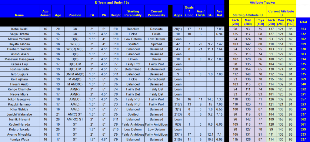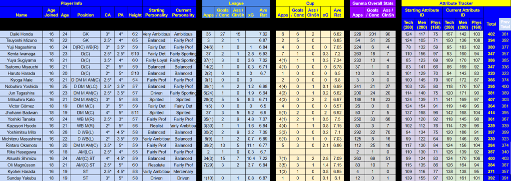 Rasamu’s attribute ID system revealed the best player Gunma had ever had was Colombian midfielder Badwan, who’d developed to 414. He’s closely followed by Kato (407), goalkeeper Daiki Honda (402), Shimizu (400), Mito (397), Yoshida (395) and backup keeper Tsuyoshi Mizuno (394). Click the chart below to see how the players fared this season.