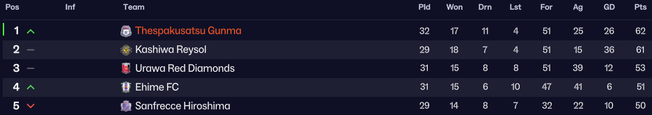 Gunma’s solid form continued, while Kashiwa’s continental exploits left them with four games in hand by the start of April. Kashiwa lost the first of those, which was their first league defeat since early October, then drew back-to-back games before Gunma drew 1-1 at Hiroshima. That meant that with six games remaining, Gunma led the way on 62 points, 1 clear of Kashiwa with 3 games in hand. It was likely a two-horse race for the title, but Urawa Reds were 9 points behind Gunma with a game in hand, and Hiroshima were 12 back with 3 games in hand.