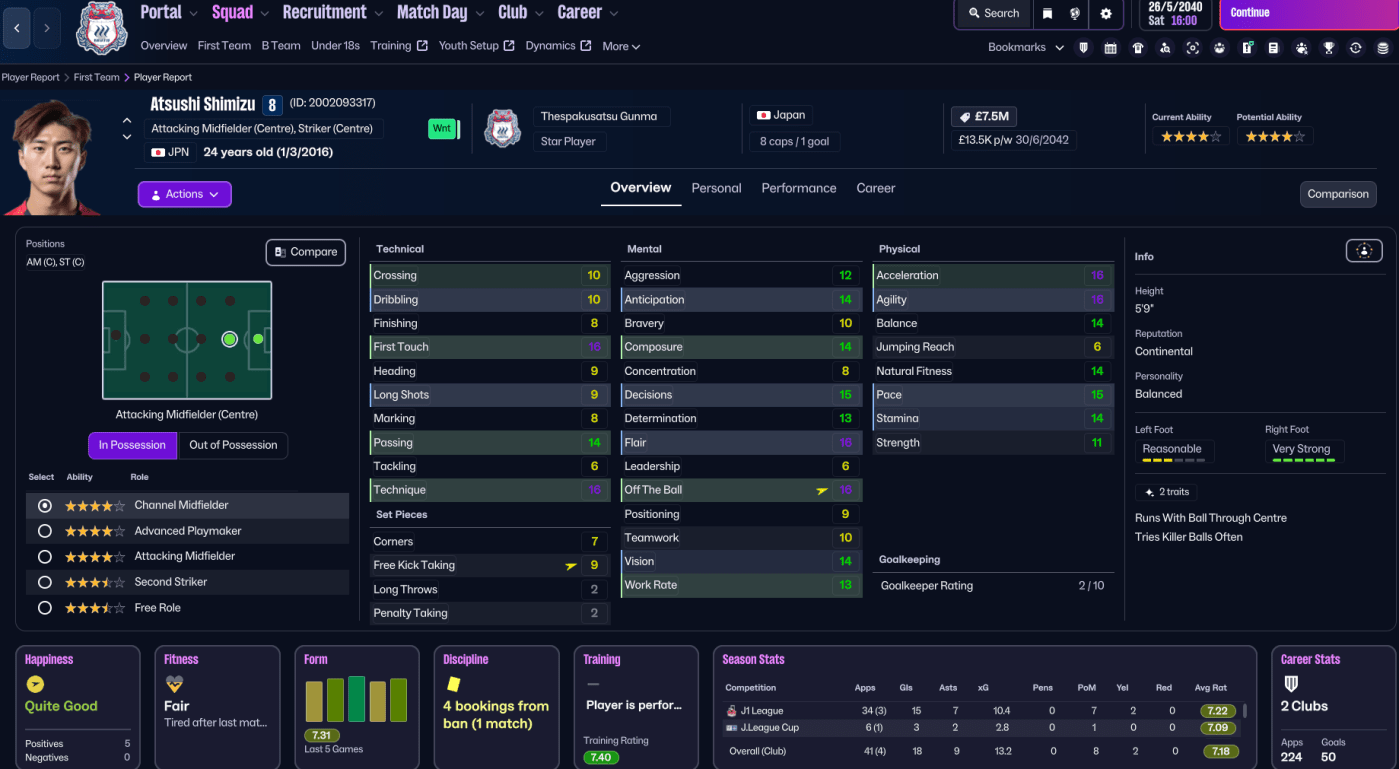 Off the pitch, that was certainly the case, as Gunma became the fourth most reputable club in Japan, behind Kashiwa Reysol, Gamba Osaka and Kashima Antlers. Chairperson Takanori Yamazaki announced plans to build a new stadium, and began the process of searching for suitable sites and possible investors. While another annual profit of £12.5m saw them go into the 2039/40 campaign with £49m in the bank. And Rasamu continued his mission to improve Gunma’s youth by securing the club’s first international affiliate agreements with Defensor Sporting in Uruguay and Al-Wahda in UAE.