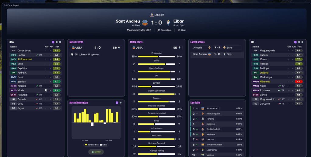 Gameday 38 – Eibar (17th, home): That meant Sant Andreu could wrap up promotion and potentially the title with victory over Eibar. Gogu went close following a cheeky short corner routine as they bossed the first half by 11 shots to 3. They got a break as an Eibar goal was disallowed for offside, and went down the other end to score as Iglesias passed for Marín to fire into the top corner. Iglesias hit the post in injury time but they cruised to a dominant 1-0 win that secured the title.