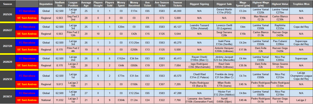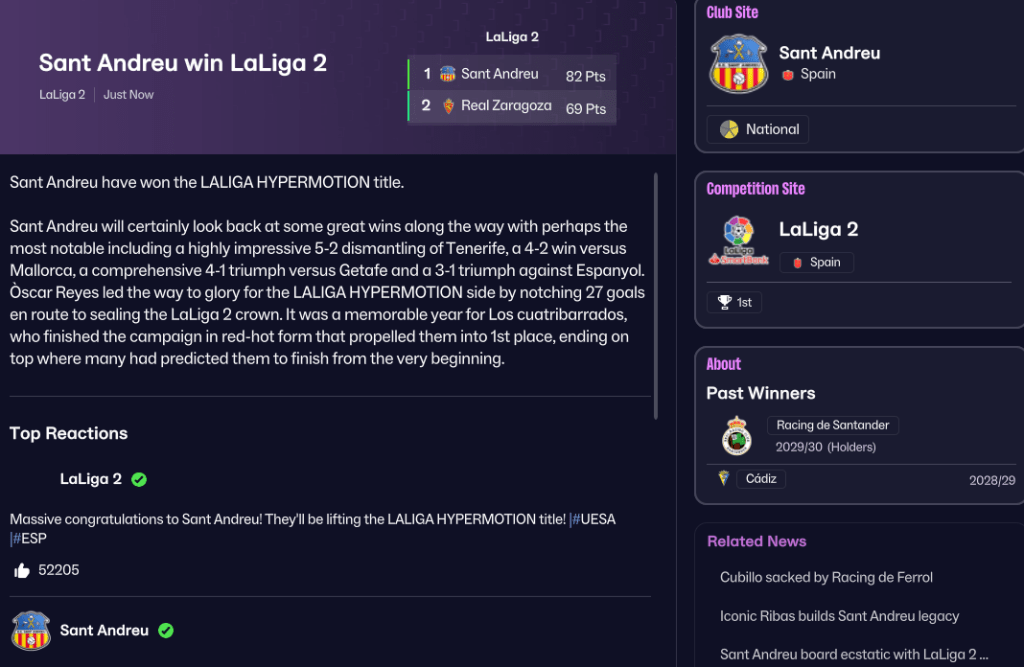 Ribas knew his young stars would be under-rated by many, but he certainly hadn’t expected them to fire Sant Andreu to LaLiga 2 glory! The league title and promotion meant that Turf Wars would heat up next season. Sant Andreu not only finished above Barcelona Atlétic for the first time, but they would compete with their cross-city rivals FC Barcelona for the first time next season.
