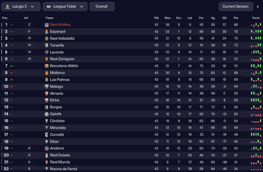 Sant Andreu went on to win the league by 10 points from Espanyol, finishing on 86 points after 26 wins, 8 draws and 8 defeats. They topped the league with 92 goals scored and conceded the 7th-fewest 55, despite only Murcia having fewer than their 3 penalties and scoring just 5 goals from set pieces. Sant Andreu also created the most chances (189) and had the most shots (676), along with the most high-intensity sprints (6,017), 2nd-most dribbles (720), 5th-most possession (54%), the 5th-best conversion rate (13%), the 6th-best cross completion (20%), the 8th-most completed passes (21,899),