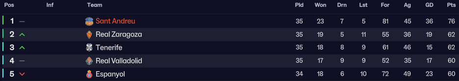 Gameday 36 – Elche (12th, home): Sant Andreu began the title race with another flurry of injuries and slipped to a 1-0 defeat at home to Elche, managed by former Leeds attacker Pablo Hernández. Zaragoza also drew but Tenerife beat Racing 3-1 to close the gap to 12 points.