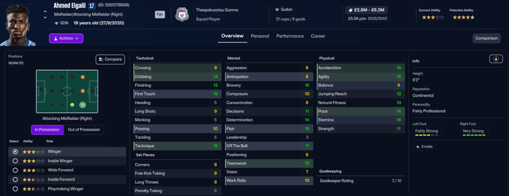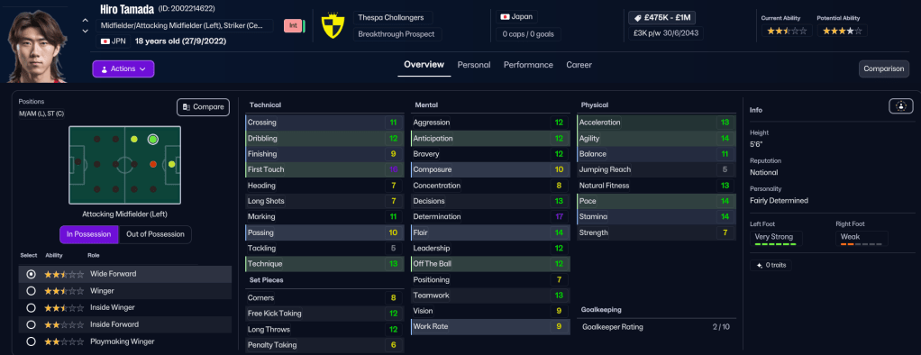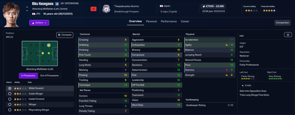 Finances were boosted by midfielder Víctor Gómez, who contributed 0 goals or assists in 26 games, attracting surprise bids from Porto and Man United, who he joined for £6.5m. Centre back Yuji Nagashima also departed after 263 games for the club to Saudi for £3.5m, along with backup attacker Oli Magnusson to ReinMeer for £1.1m and left back Michiteru Masushima to Sendai for £300k. That boosted the bank balance to £48m, while Rasamu had a transfer kitty of £47m that he couldn’t really dream of spending. Instead, he dished out a few new contracts, including wingback Yoshimitsu Mito pocketing a club record £19,500 per week that was swiftly surpassed by Japan international midfielder Atsushi Shimizu bagging £45k a week once he’d ended his unhappiness at the club.