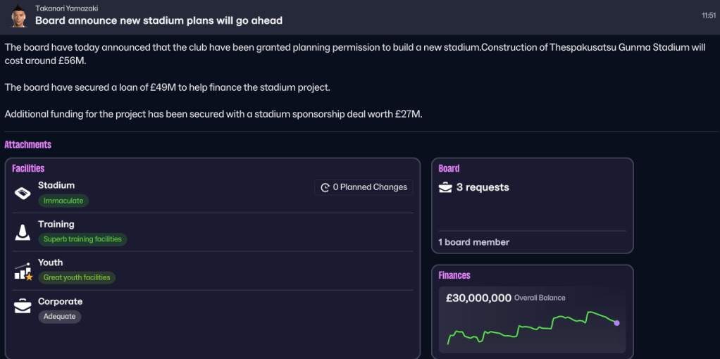 Heading into his 15th season, and 10th in J1 League, the club’s board announced plans for a new stadium. The imaginatively named Thespakusatsu Gunma Stadium will cost £56m, plunging the club into debt with a £49m loan offset by a £27m sponsorship deal. And they immediately began paying that debt off with monthly fees of £450k.